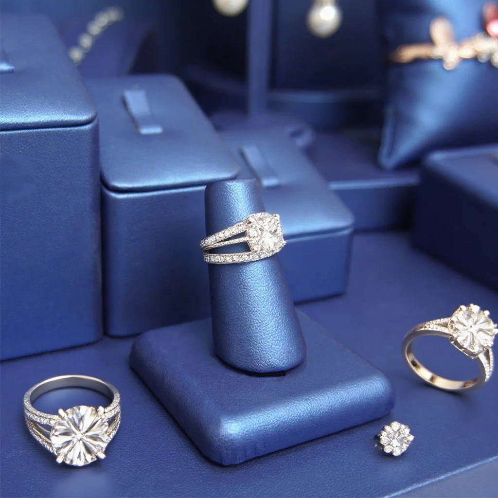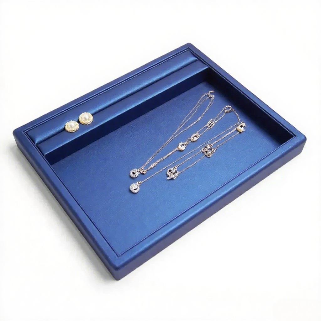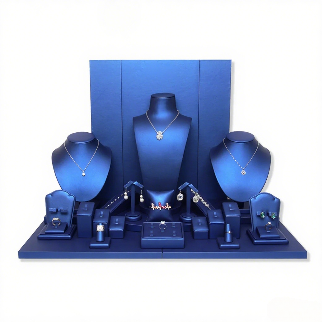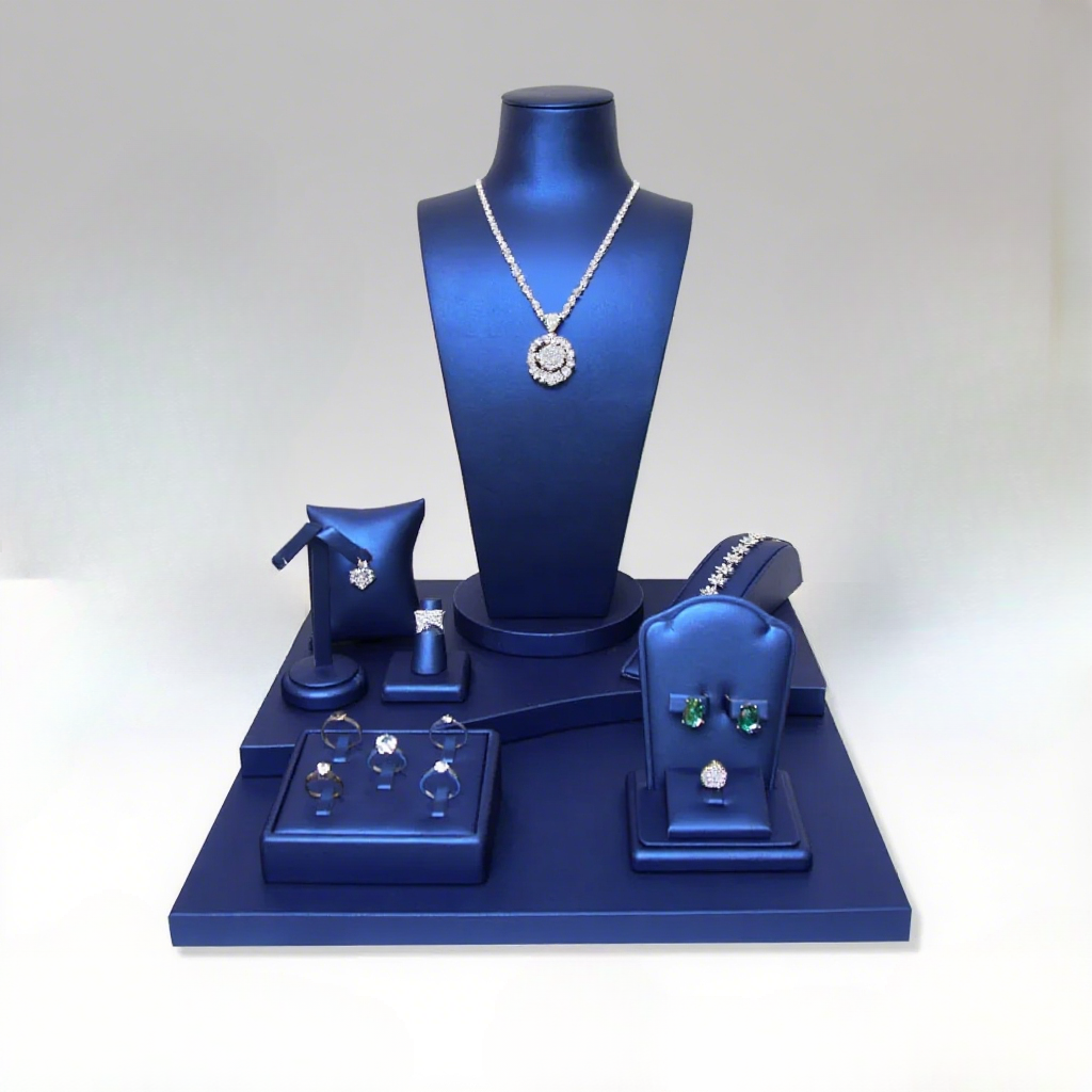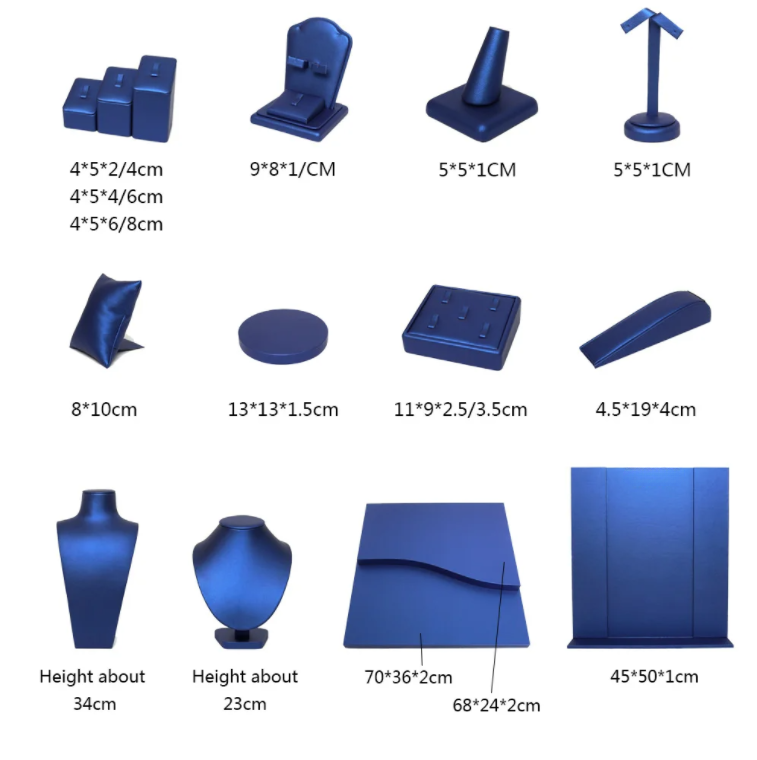FADELI Custom Design Luxury Classic Blue PU Leather Covered Jewelry Display Stand for Earrings Ring Necklace Jewelry Display Set