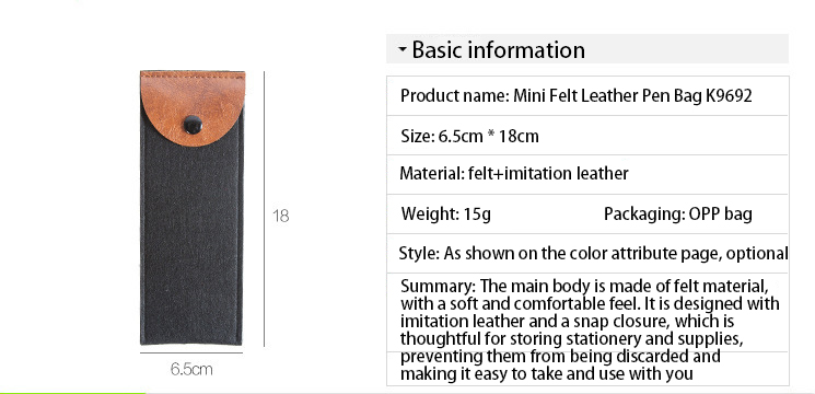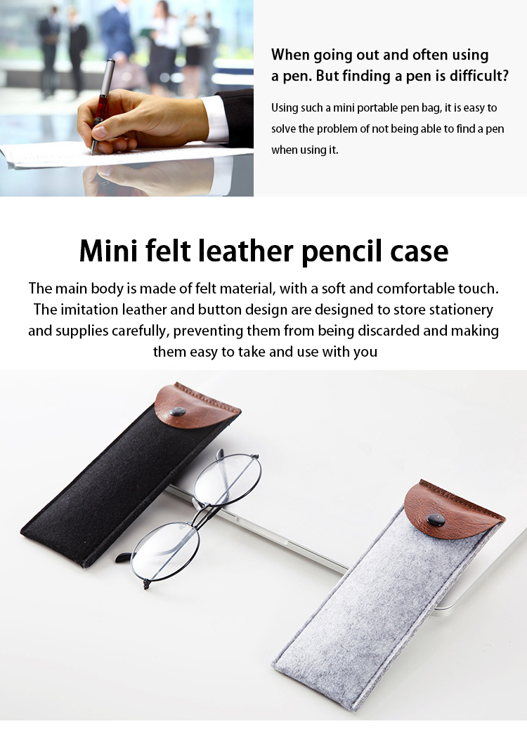 Essential details Type: Pencil Bag Material: felt Use: Schools & Offices Novelty: Yes Brand Name: Liming Model Number: LM-069 Place of Origin: Guangxi, China Product name: Pencil Pouch Pen Bag Color: Customized Color Logo: Customer Log