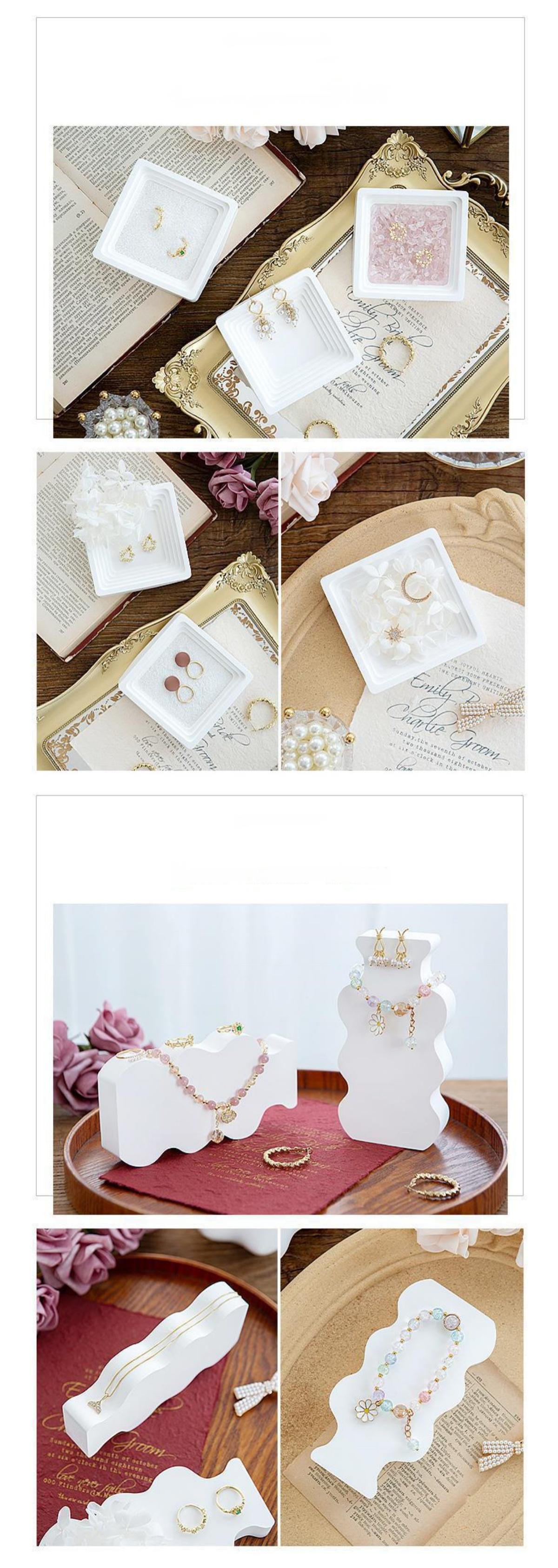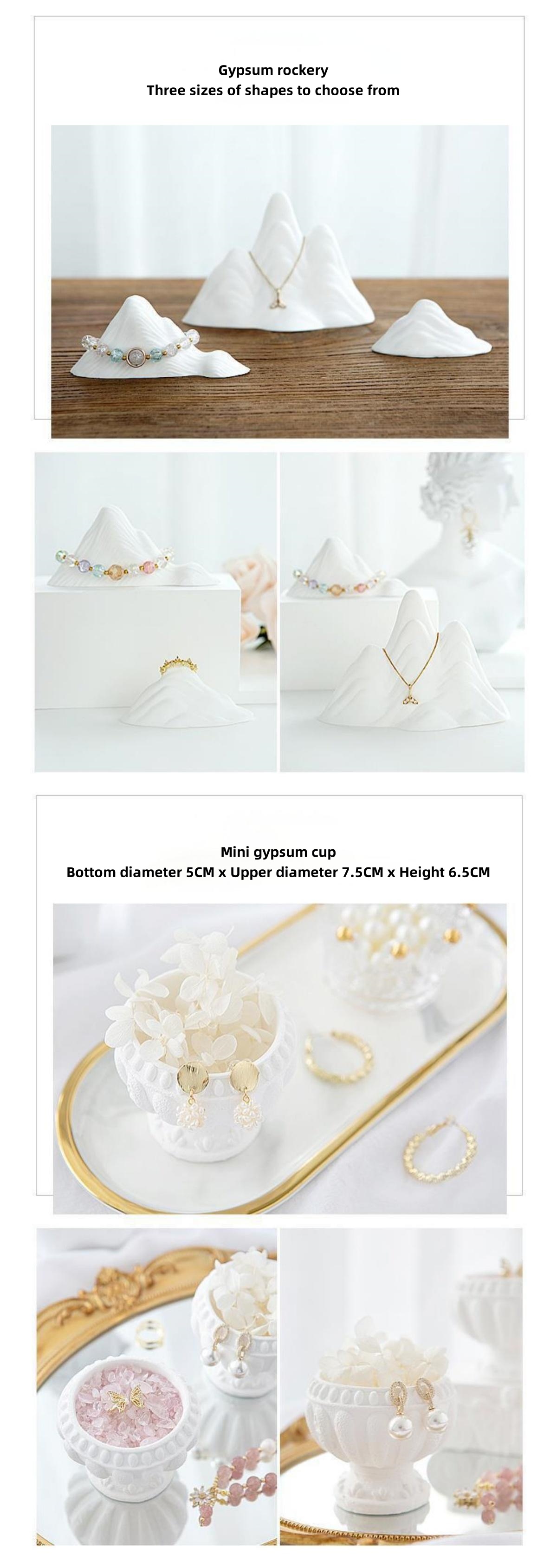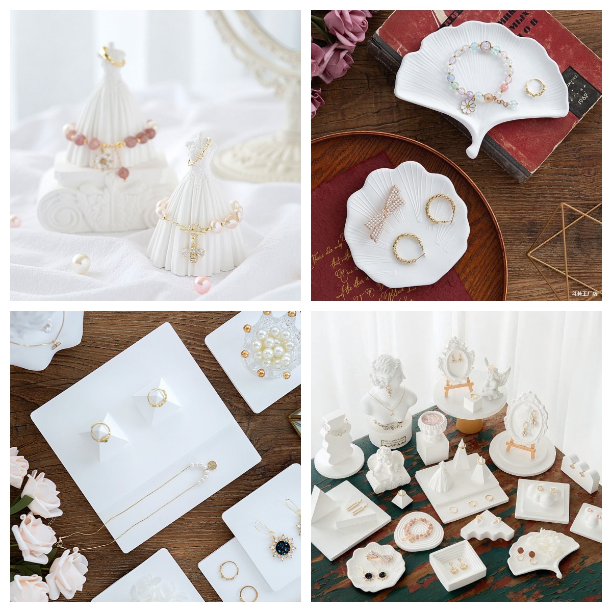 This collection of jewelry display props features anthropomorphic plaster figurines alongside circular and cylindrical jewelry racks. Crafted primarily from pristine white plaster, these minimalist yet elegant components serve as display surfaces for necklaces, earrings, rings, and other accessories. Against the understated white backdrop, the exquisite craftsmanship of the jewelry is accentuated to perfection, creating an atmosphere that radiates sophisticated elegance.