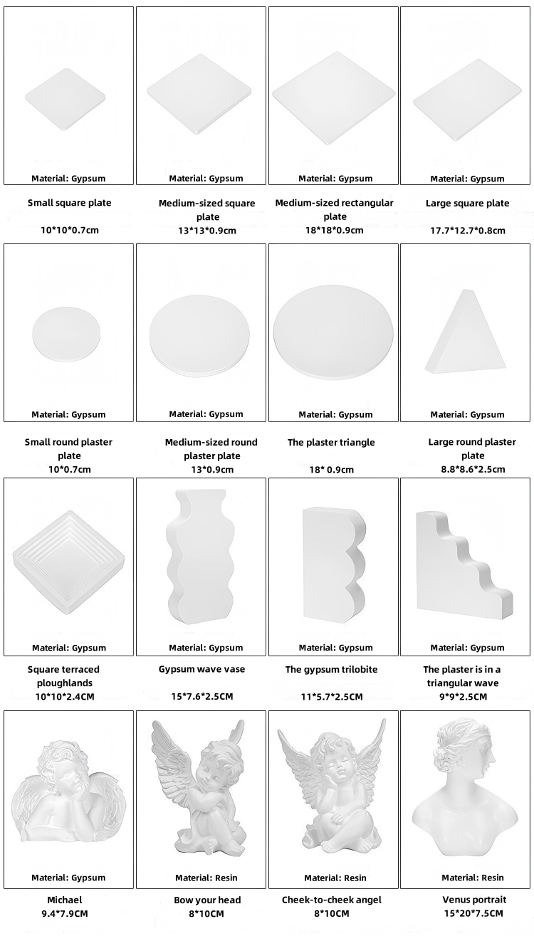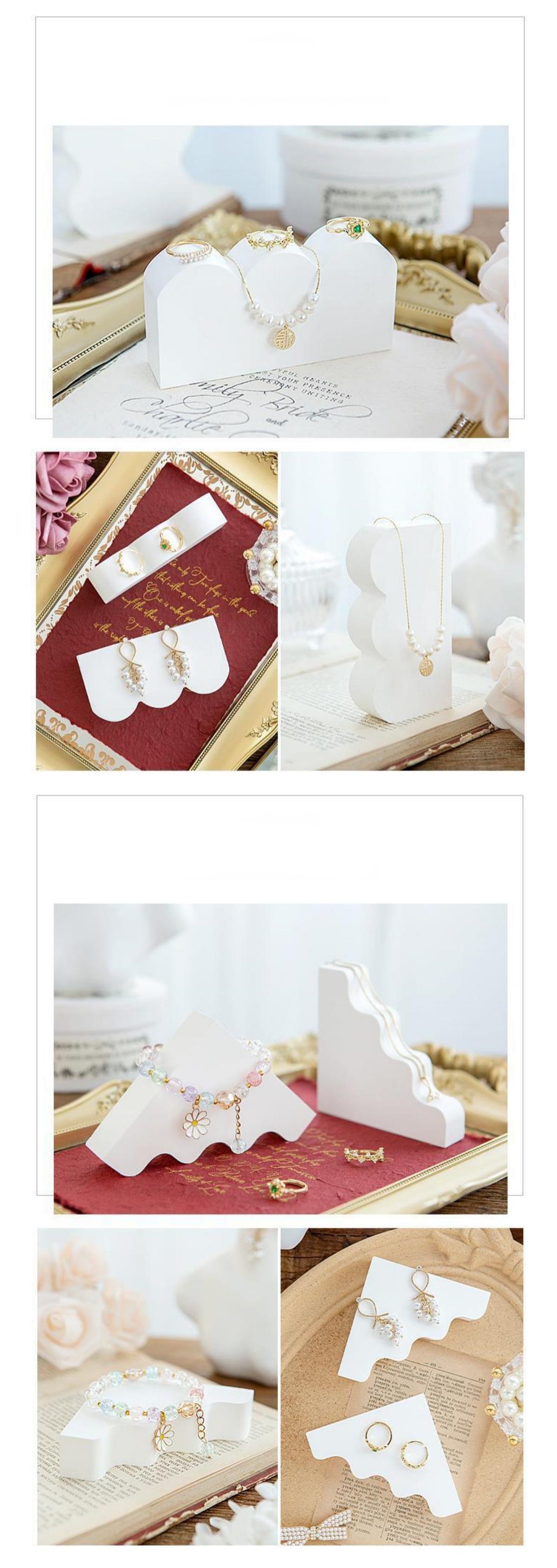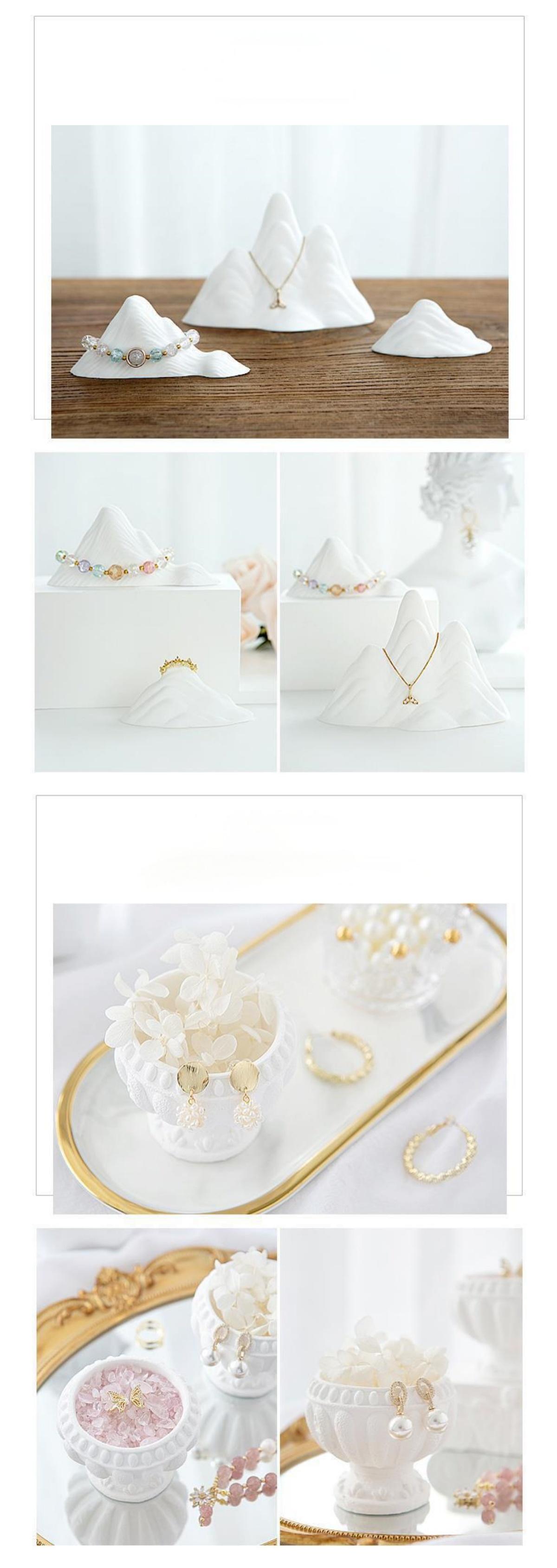 This collection of jewelry display props features anthropomorphic plaster figurines alongside circular and cylindrical jewelry racks. Crafted primarily from pristine white plaster, these minimalist yet elegant components serve as display surfaces for necklaces, earrings, rings, and other accessories. Against the understated white backdrop, the exquisite craftsmanship of the jewelry is accentuated to perfection, creating an atmosphere that radiates sophisticated elegance.